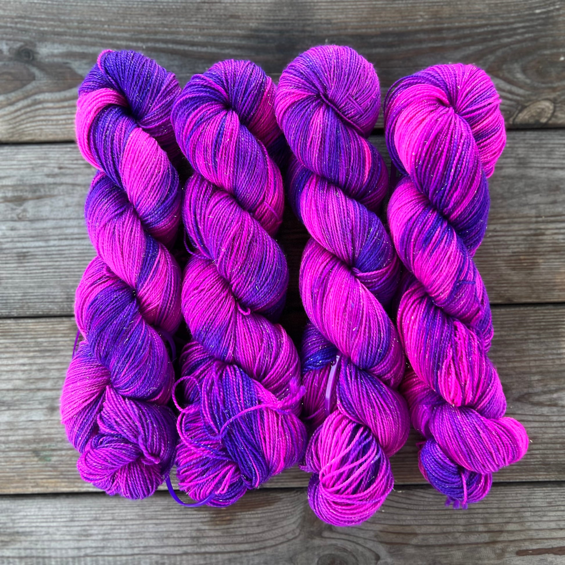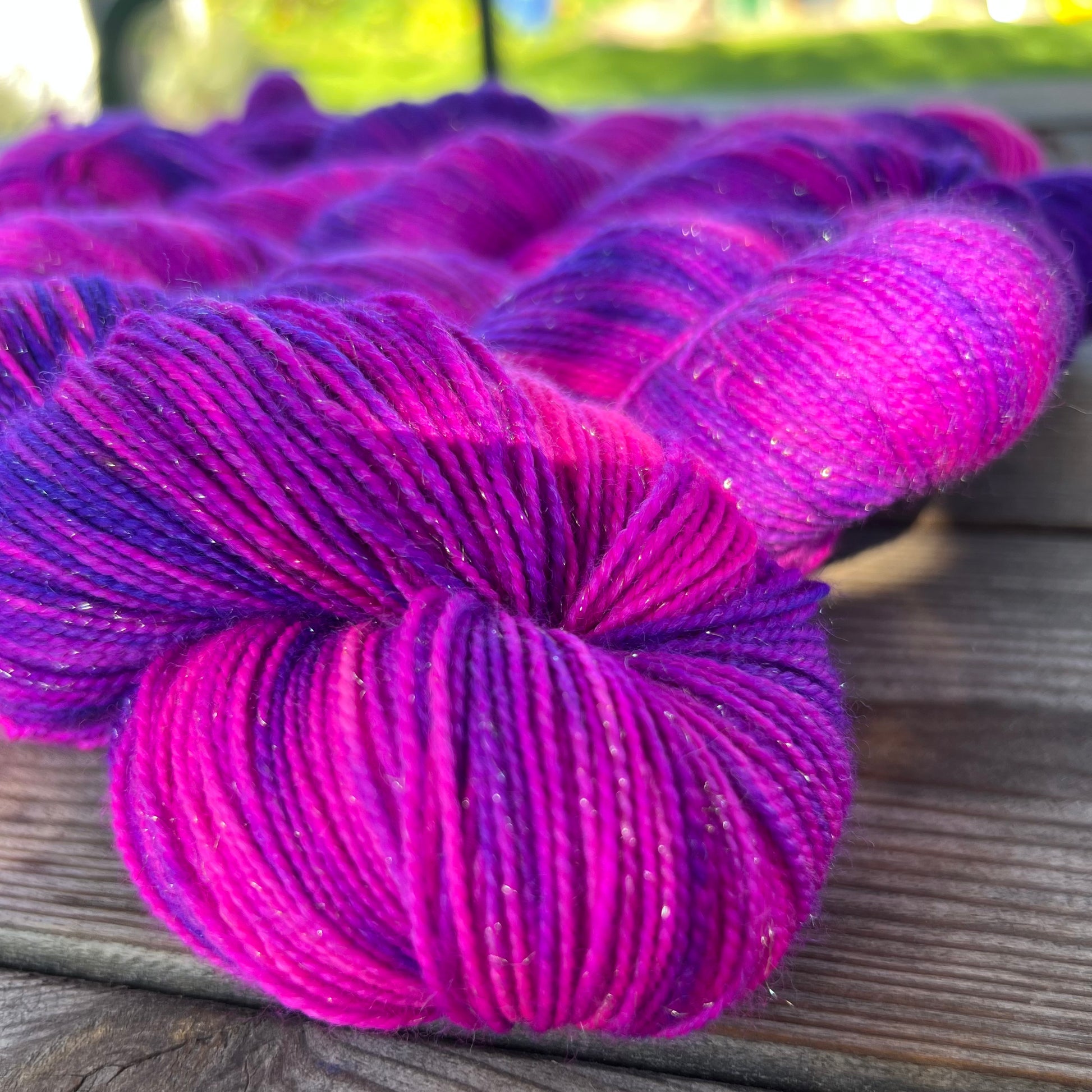 Garn fra Køge håndfarvet glimmersock farve: “Dancing Queen”