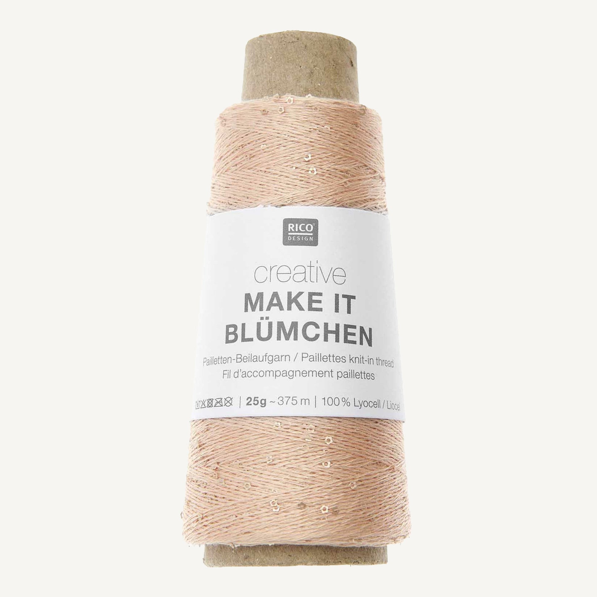 Make It Blümchen er et tyndt og fint effektgarn med bittesmå pailletter, formet som søde, små blomster. Denne følgetråd giver diskret glitter til alverdens strikke- og hækleprojekter, og tykkelsen påvirker ikke fastheden i arbejdet.